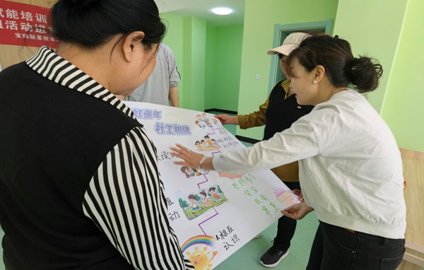 培训现场,专业社工采用理论加实践相结合的方式。先从开展小组活动的意义、如何策划一场小组活动、活动中应该注意的哪些事项等等对儿童主任进行了细致的讲解,然后通过让儿童主任全程参与到小组活动中来亲身体验,与孩子们一起玩游戏、做手工,当进行到活动中的某些细节时,专业社工会停下来对儿童主任进行特别的解说。